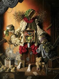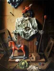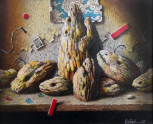بنابراین گشتن و جستن در درون آثار خاکدان قرین است با نزدیک‌شدن به این امر ذهنی و درونی. از نور بی‌رمقی که از پنجره این اتاق همه‌جا همیشه حاضر می‌تابد، فیگورهایی که همواره در یک‌جور تنش گرفتارند و رنگ‌های قدرتمندی که بر پس‌زمینه عمدتا قهوه‌ای آثارش می‌نشیند‌ تا عکس‌های کوچک و بزرگ سیاه‌وسفید که گویی یادآور خاطراتی ویژه‌ هستند، همگی در کنار هم‌ به خنزرپنزرهایی می‌مانند که در گوشه یک اتاقک مطرود و متروک روی هم دپو شده‌اند. این خنزپنزرها، هرکدام به‌ تنهایی‌ و همچنین در کلیت‌شان، بیانگر درونی پرآشوب‌ هستند‌ و این درون پرآشوب گواهی است بر این واقعیت که بسیاری از آثار او تمی ملانکولیک دارند. سایه این ملانکولی آن‌قدر بلند و گسترده است که‌ گویی در نقاشی‌های او زمان، تا آن‌جا که مخاطب بخواهد، می‌ایستد. زمان می‌ایستد و تمام اشیا موجود در تصویر چشم در چشم ناظر، مدام به او زوال خود و ناظر را زمزمه می‌کنند؛ از نگاهی دیگرمیراث تئاتری پدر، خاطرات سرزمین مادری مراغه و آذربایجان و تجربه‌ی این مهاجرت با مختصات نمایشی و روایی نقاشی‌های او پیوندی عمیق دارد.